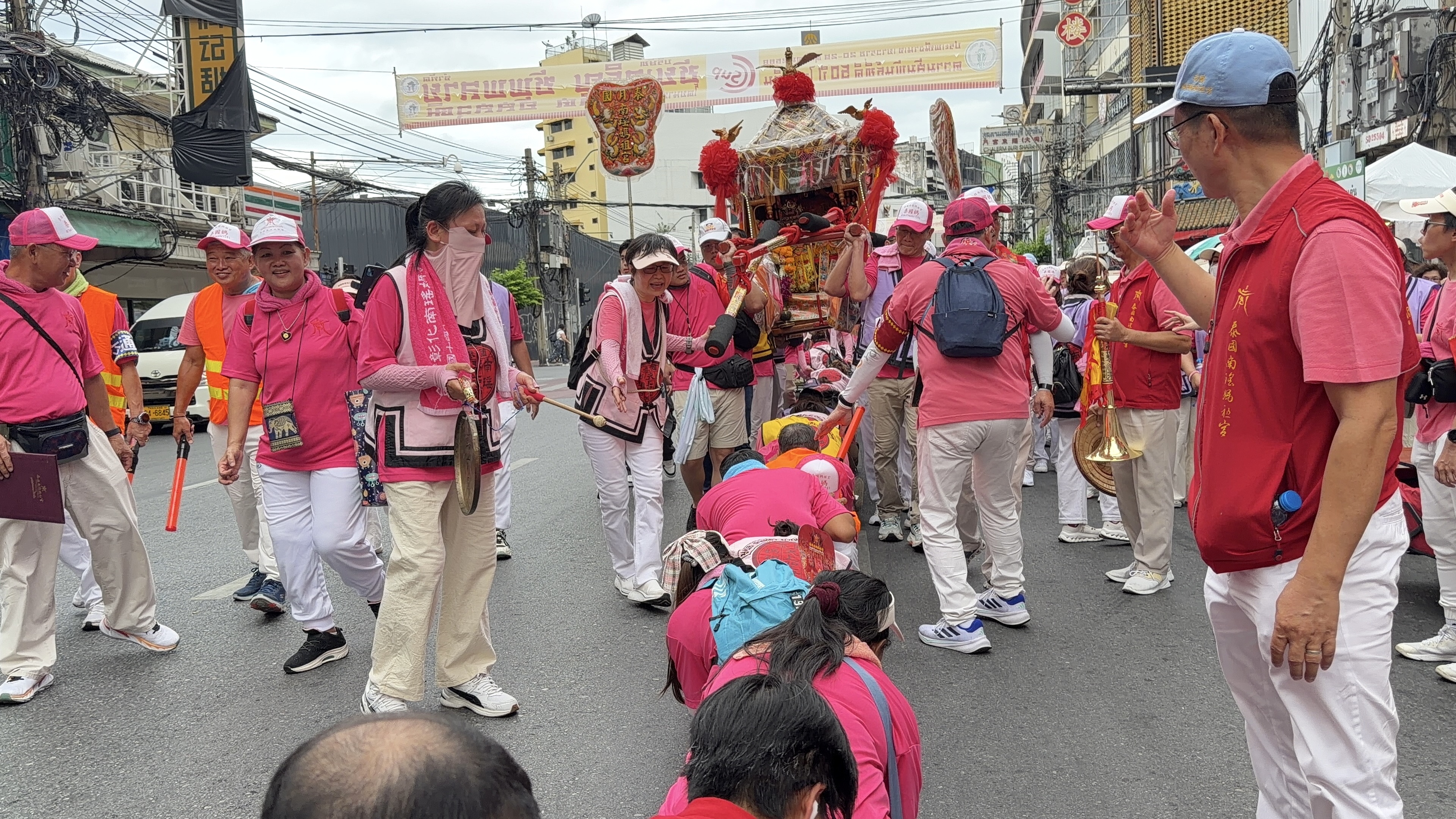 電音三太子率先領軍登場,北管鼓樂與旗陣開道,媽祖鑾駕沿唐人街緩緩前行,沿途駐駕天后聖母宮、廣肇會館、順興宮、天華慈善院與慈濟寺等重要廟宇。街道兩旁香煙裊裊、善信雲集,許多泰國民眾與外國遊客也親身體驗「鑽轎底」祈福儀式,感受來自台灣的信仰力量與文化魅力。