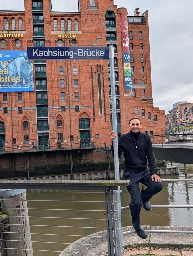 德國漢堡自民黨籍區議員費雪主導推動「高雄橋」命名案,盼讓台灣與德國之間的民主夥伴關係在城市日常中具象可見。掛牌後費雪第一時間開心與高雄橋合照,這是德國首座以台灣城市命名的交通設施。(費雪提供,中央社記者林尚縈柏林傳真)