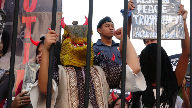 菲律賓數百名學生與青年25日傍晚在奎松市乙沙大道人民力量革命紀念碑前發動創意示威,以驚悚裝扮希望「嚇退貪污者」。圖為示威者裝扮成紅魔。(中央社記者林行健奎松市攝)