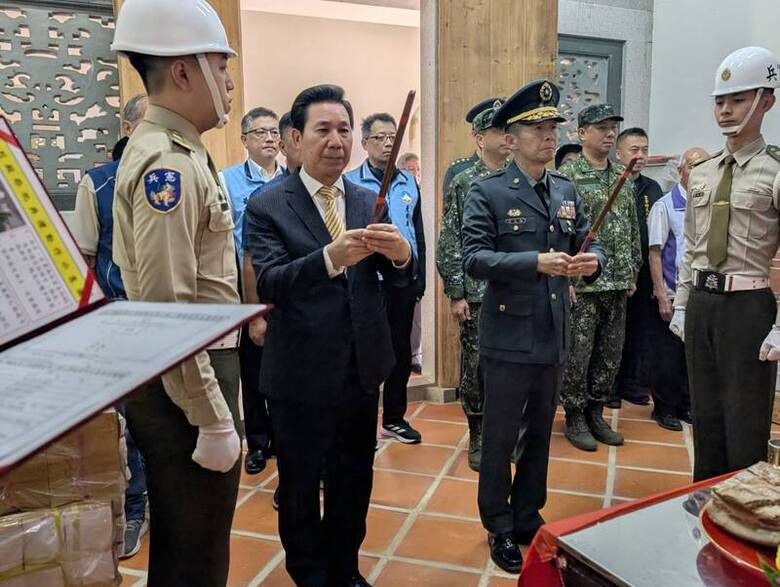 「金門縣秋祭古寧頭戰役陣公亡將士暨萬聖祠先靈祭典」25日舉行,金防部指揮官黃先任中將(右2)與金門縣長陳福海(左2)前往古寧頭萬聖祠向軍民牌位上香。(中央社記者吳玟嶸攝)