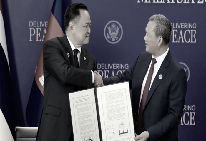 (台泰時報10月27日電)泰國總理阿努廷(Anutin Charnvirakul)於26日在馬來西亞吉隆坡出席與柬埔寨總理洪瑪內(Hun Manet)的會談,雙方共同簽署和平聯合聲明,確立落實停火協議與修復雙邊關係的具體路線圖。美國總統川普(Donald J. Trump)與馬來西亞總理安華(Anwar Ibrahim)以見證人身分出席儀式,強調此舉將為東協區域穩定開啟新篇章。