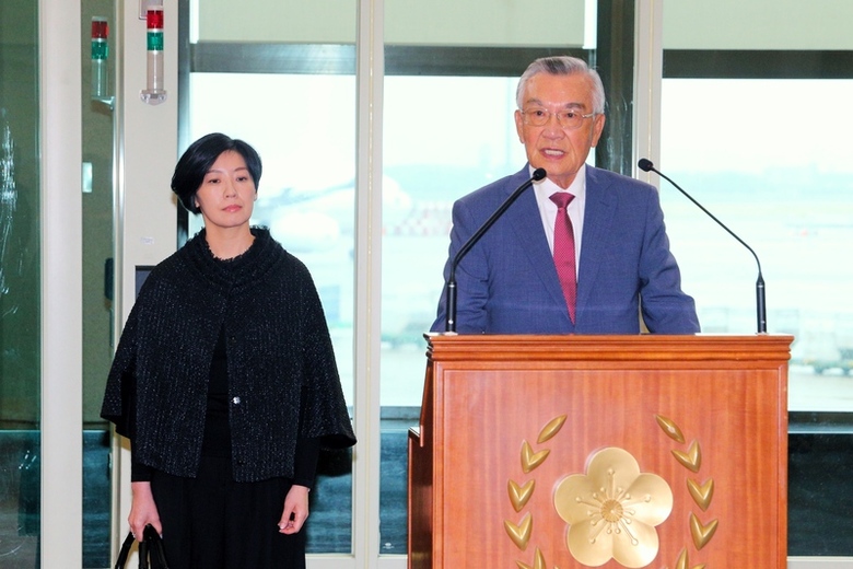 2025APEC領袖會議在韓國慶州舉行,代表總統賴清德出席的領袖代表林信義(前排左)28日啟程,國安會秘書長吳釗燮(前排右)也前往桃園國際機場送機。(中央社記者吳睿騏桃園機場攝)