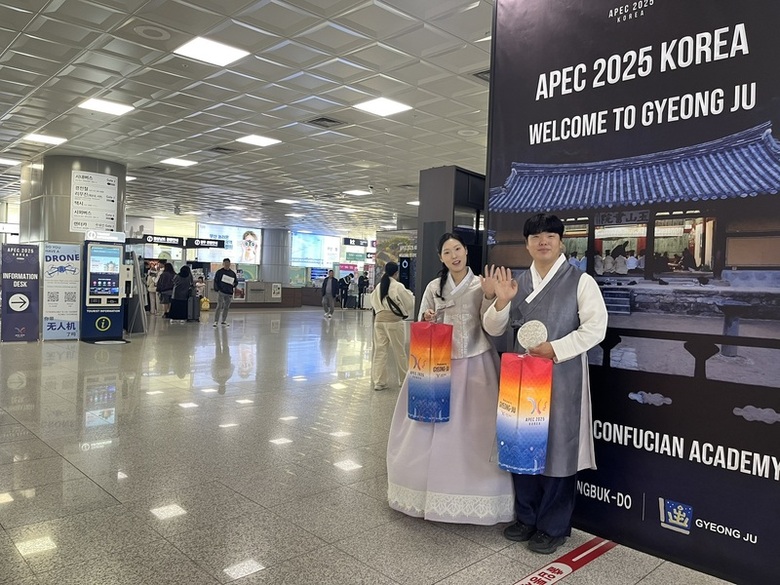 入境韓國後,機場大廳可看到多位穿著韓國傳統服飾的迎賓人員,手提色彩鮮豔,呼應APEC 2025徽章主色調的燈籠,迎賓人員遇到遊客拍照,也會熱情揮手。