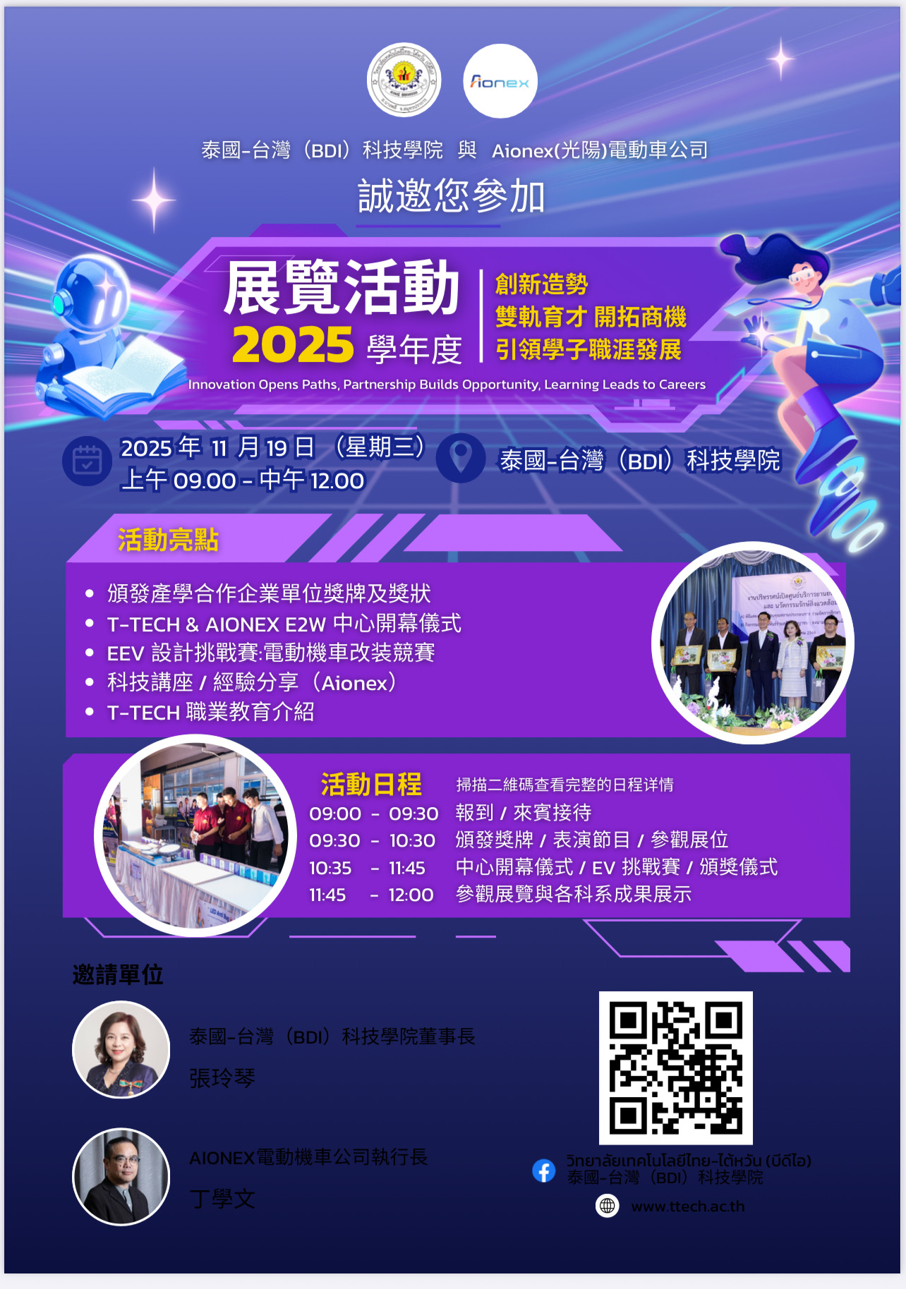 泰國–台灣(BDI)科技學院與 Aionex(光陽電動車公司)將於 2025 年 11 月 19 日(星期三)上午 9 時至中午 12 時,於學院校區隆重舉辦「2025 學年度展覽活動」,以「創新造勢、雙軌育才、開拓商機,引領學子職涯發展」為主題,全面展現校方推動技職教育國際化與綠能產業鏈結的成果。