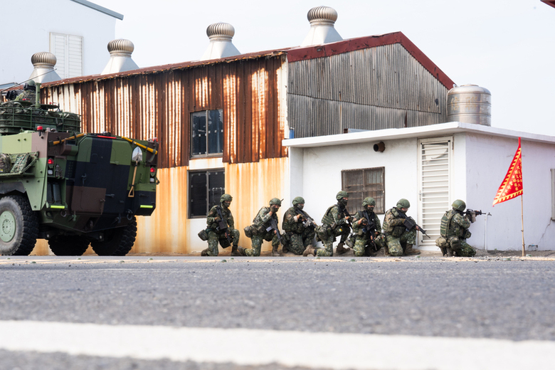 陸勝一號操演25日舉行,30日參演部隊542旅、234旅於雲林褒忠、元長一帶接觸,圖為234旅官兵下車警戒,準備戰鬥。(中央社記者游凱翔攝)