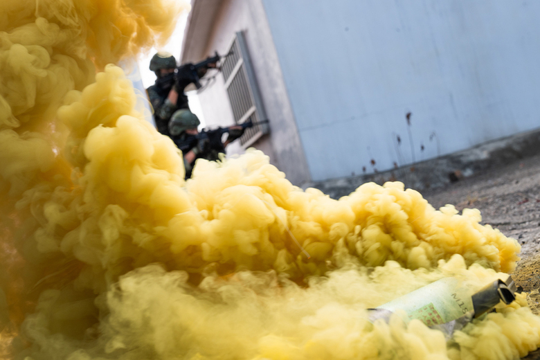 陸勝一號操演25日舉行,30日參演部隊542旅、234旅於雲林褒忠、元長一帶接觸,統裁部下達234旅實施攻佔,圖為官兵投放煙霧彈以掩蔽受傷官兵。(中央社記者游凱翔攝)