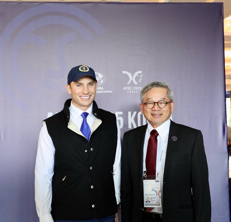 國科會主委吳誠文(右)於2025年韓國APEC部長級年會(AMM)期間,會晤美國國務院經濟成長、能源暨環境事務次卿海爾伯格(Jacob Helberg)(左)。(APEC台灣代表團提供,中央社記者潘姿羽傳真)