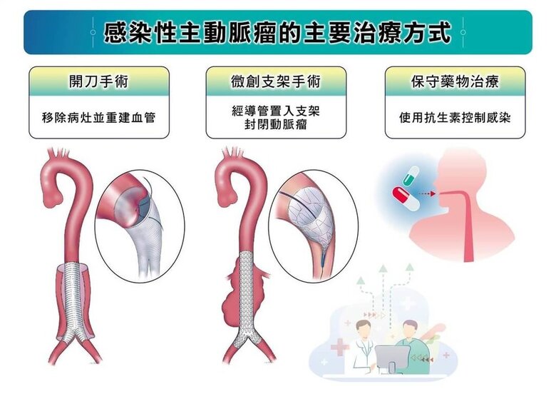 感染性主動脈瘤的3種主要治療方式,包含開刀手術、血管內微創修補以及保守藥物治療,不同方法各有適用情況,醫師會依病人的整體健康狀況與疾病特性,選擇最合適的治療方案。(長庚醫院提供,中央社記者曾以寧傳真)