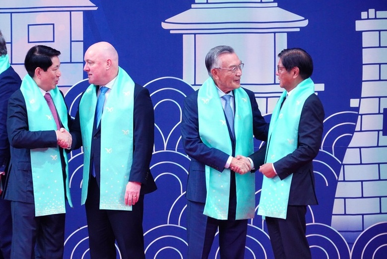 合影前,林信義先與身旁的厄伯拉特握手寒暄,合影過後,林信義主動傾身與斜前方的馬來西亞首相安華握手,隨後小馬可仕主動與林信義握手致意,林信義也輕拍小馬可仕手臂,兩人邊走邊聊,離開會場。