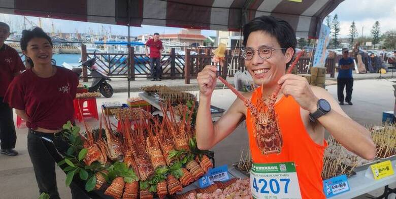 2025菊島澎湖跨海馬拉松,來自國內外3400多名選手,2日拂曉時分開跑,場面盛大,參賽選手可在賽道10處美食攤位中,品嚐龍蝦、花枝丸等海鮮與在地特色美食。(中央社)