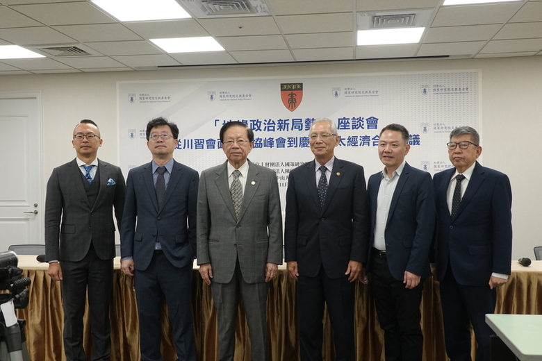 國策院3日舉辦「『地緣政治新局勢』座談會:從川習會面、東協峰會到慶州亞太經濟合作會議」,由國策院院長田弘茂(左3)致詞揭幕,副院長郭育仁(右2)、執行長王宏仁(左1)擔任引言人。(中央社記者楊堯茹攝)