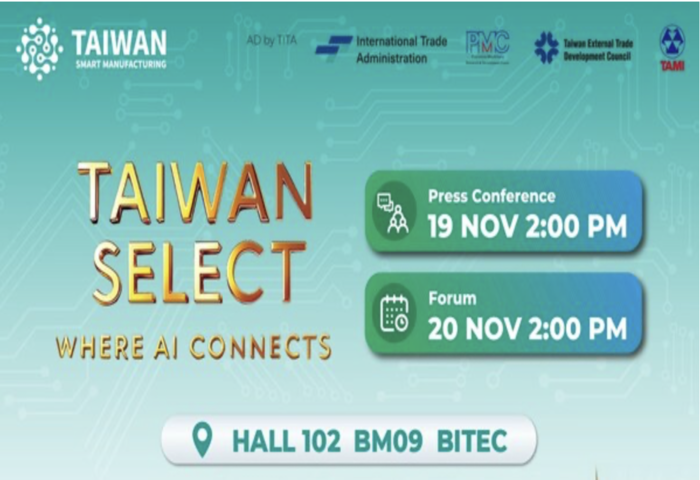 台灣館將於11月19日(星期三)下午2時在會場102館BM09攤位舉行「TAIWAN SELECT」新品發表會,現場除產品展示外,亦開放業界交流洽談。翌日由精密機械發展中心主辦的「智慧製造未來論壇」(PMC Forum)將邀請東台精機(Tongtai)、力勁機械(L.K. Machinery)及帕瑪利代表出席,分享在數位化、永續發展與台泰產業合作方面的實務經驗。