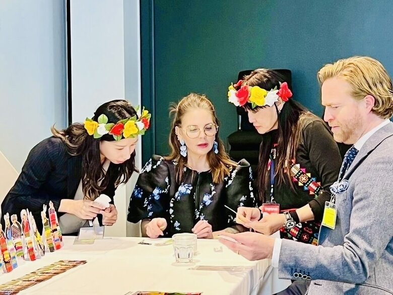 交通部觀光署率領台灣觀光代表團3日於瑞典斯德哥爾摩舉辦台灣觀光推廣會,為展現台灣的多元文化與熱情好客,現場安排精彩的文化展演,與文化體驗如老屋窗花木作杯墊、原民服飾編織書籤等手作活動。(交通部觀光署駐倫敦辦事處提供,中央社記者辜泳秝斯德哥爾摩傳真)