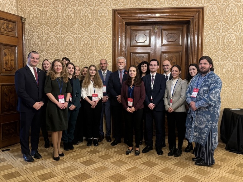 歐洲價值安全政策中心(EVC)5日舉辦第11屆「歐洲價值高峰會」,捷克總統帕維爾(中)與EVC團隊合影。(中央社記者劉郁葶布拉格攝)