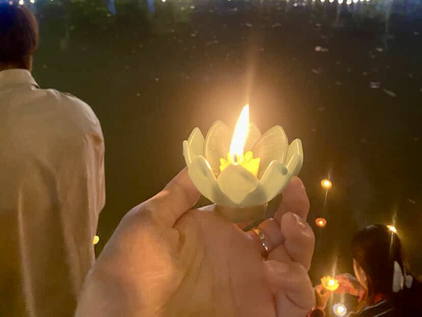 在社區與學校裡,依舊可見人們親手編織水燈。香蕉葉被摺成蓮花形,插上三枝香與一根蠟燭,象徵佛、法、僧三寶與心中的光明。有人寫下「願家人平安」、有人寫「願王太后安息」。燭光漂流的同時,信仰、思念與感恩也在水面交會。這樣的畫面,也許比煙火更亮,因為它亮在心裡,而非天空。
