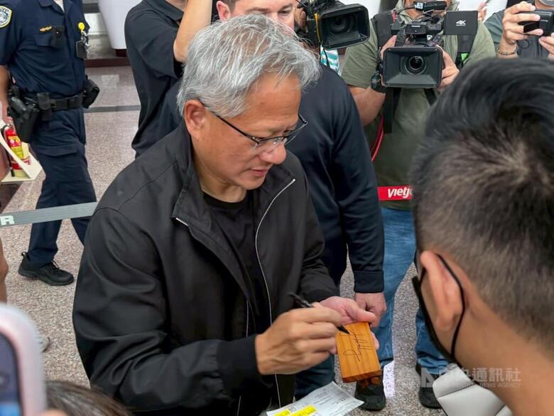 (中央社台北7日電)輝達(NVIDIA)執行長黃仁勳下午搭乘專機抵達台南,短暫接受媒體採訪後將前往南科台積電18廠,視察先進製程3奈米產線,預計快閃停留台南5小時,隨後趕赴台北;他親口證實明天將出席台積電運動會,預計在台灣停留時間一天半。