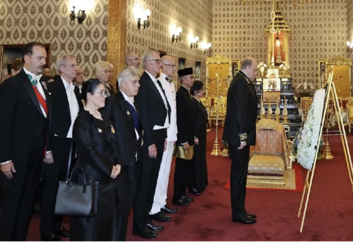 (台泰時報11月8日電)來自世界各地的外交使節於11月7日下午3時30分齊聚曼谷大皇宮都實瑪哈巴沙皇家殿堂(Dusit Maha Prasat Throne Hall),在王太后殯櫬前獻上花圈,以表達對詩麗吉王太后(Her Majesty Queen Sirikit The Queen Mother)的深切敬意與追思。