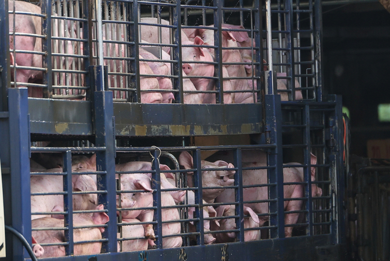 圖為滿載活體豬隻的運豬車抵達新北市肉品市場。(中央社檔案照片)