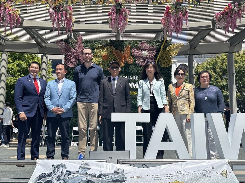 加州參議員威善高(左3)上個月底宣布投入2026年聯邦眾議院選舉,角逐裴洛西所代表的加州第11選區席位。圖為威善高參加台灣文化節活動,攝於5月10日。(中央社記者張欣瑜舊金山攝)