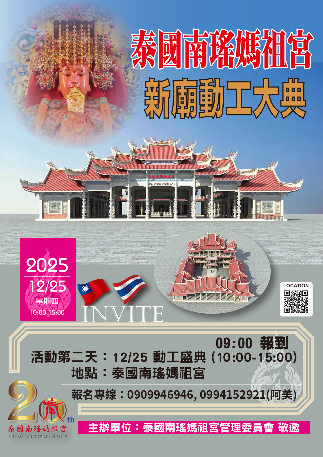 泰國南瑤媽祖宮自 2005 年自台灣彰化南瑤宮分靈至泰國以來,已邁入第二十個年頭。為感謝眾善信長年護持、並迎接新廟啟建的歷史時刻,南瑤媽祖宮管理委員會將於 2025 年 12 月 24 日與 25 日 隆重舉辦「二十週年感恩晚宴暨新廟動土大典」。