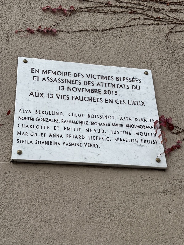 許多民眾帶著花束、蠟燭、留言或手繪圖,在多個案發地點向罹難者致意。當年遭攻擊的餐廳「小柬埔寨」(Le Petit Cambodge)重新裝潢開業後,至今仍受巴黎人歡迎。