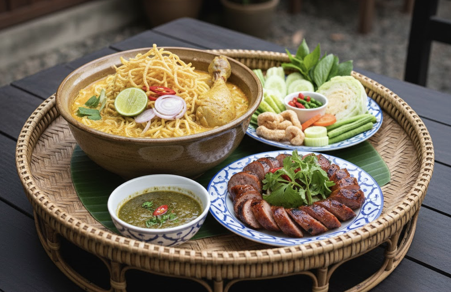 ข้าวซอย (Khao Soi):咖哩蛋麵,以椰奶與咖哩糊煮成湯底,上頭再撒上炸脆麵,是清邁(เชียงใหม่ Chiang Mai)一帶最常被提起的代表菜。