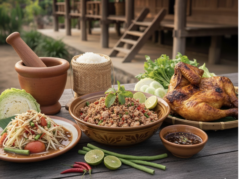 ลาบ (Larb):碎肉沙拉,以檸檬汁、魚露、辣椒粉與烤米粉調味,再拌入大量香草,是典型的「配糯米」菜。