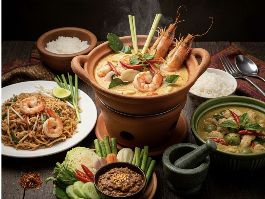 ต้มยำกุ้ง (Tom Yum Goong):酸辣蝦湯,以香茅(ตะไคร้)、南薑(ข่า)、檸檬葉熬出骨架,酸、辣、鹹兼具,是近年被列入 UNESCO 非物質文化遺產的那一碗。