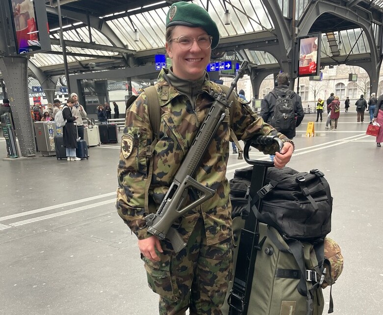 瑞士國防部每年支付交通費給瑞士的交通公司如瑞士國鐵,補貼軍中人員使用火車、電車、公車與船舶等的費用。週末時各大車站可見休假或歸營的國軍官兵,如同數據顯示,見到荷槍實彈的女兵是百分之一的機會。(中央社記者郭芳君蘇黎世攝)