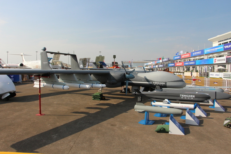 中國在長程打擊無人機領域正迎頭趕上美國。圖為珠海航展展出的「雙尾蠍」無人機。(中央社記者陳亦偉攝)