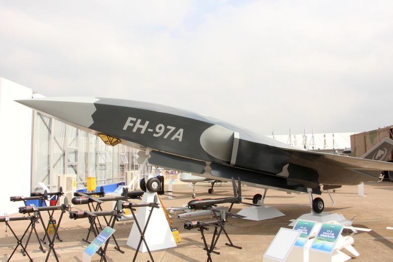中國研發及服役的忠誠僚機型號眾多,圖為珠海航展展出可與殲-20(J-20)匿蹤戰機協同作戰的飛鴻-97A(FH-97A)匿蹤攻擊無人機,以及所搭配的眾多小型自殺無人機。(中央社記者陳亦偉攝)