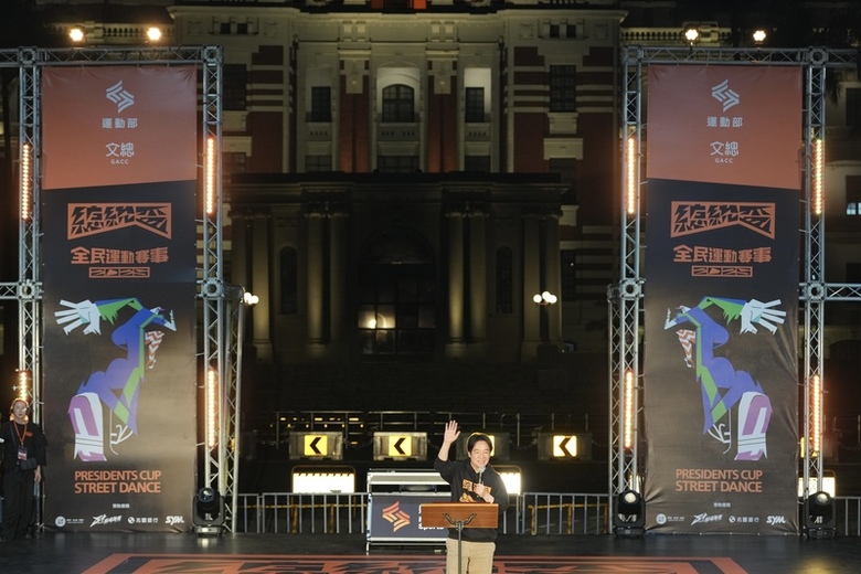 (中央社台北16日電)總統賴清德晚間出席在總統府前、凱達格蘭大道舉辦的「2025總統盃全民運動賽事-街舞大賽」決賽暨頒獎典禮,他盛讚舞者們的表演光彩奪目,照耀到整個凱道上空,也希望大家「明年再來」。