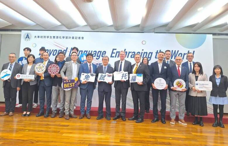 教育部17日舉行記者會,宣布啟動「EMI免試托福試辦計畫」,由教育部與學術交流基金會合作,未來學生在台灣修習一定比例的全英語授課(EMI)課程,申請至合作美國大學就學,可豁免托福成績。教育部長鄭英耀(前中)等人與會。(中央社記者許秩維攝)