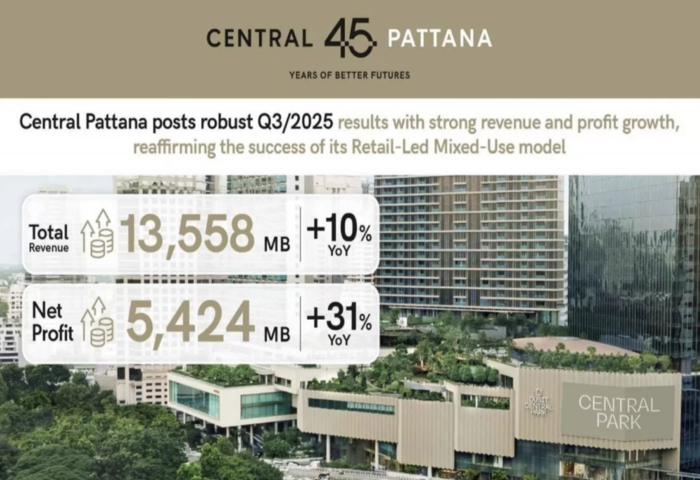 (台泰時報11月18日電)泰國Central Pattana(CPN)公布2025年第三季財報,顯示商場事業動能持續推升整體營運表現。本季營收達135億泰銖,較去年同期成長10%,淨利達54.2億泰銖,年增31%,為近年來同季最佳表現之一。