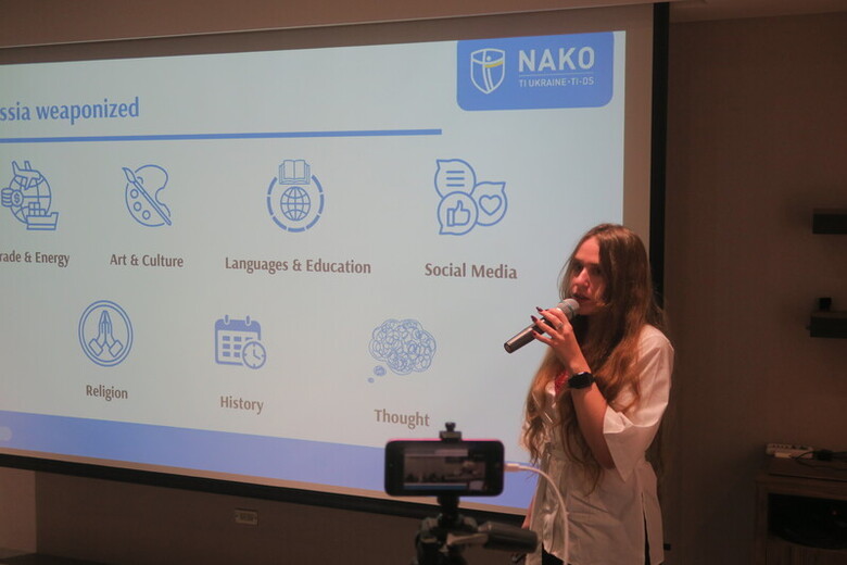 烏克蘭獨立反貪腐委員會資深研究員Viktoriia Vyshnivska上午以「俄中對民主國家的認知作戰」進行講座,指出俄羅斯擅長將生活中的各領域武器化(weaponized),從貿易、能源、文化、歷史、教育等層面,例如將烏克蘭文化捏造為俄羅斯文化的一部分,假訊息宣傳烏克蘭迫害俄語等,目的是讓世界相信烏克蘭語不存在,以及烏克蘭不是國家。