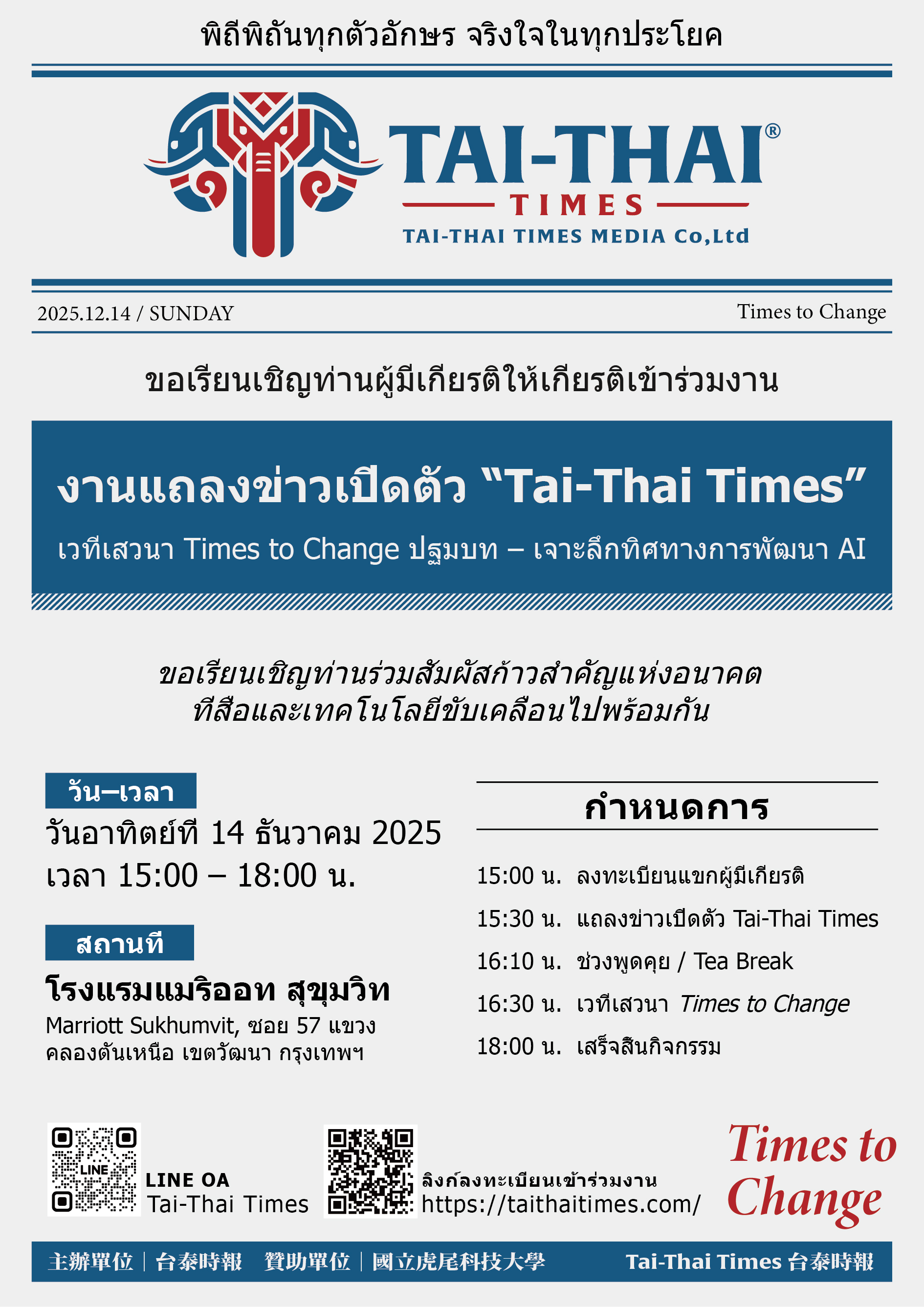 《Tai-Thai Times 台泰時報》將於 2025 年 12 月 14 日正式啟航,並同步推出 Times to Change 系列論壇,聚焦 AI 科技、媒體革新、跨國交流等新世代趨勢,邀請您共同見證台泰交流的新篇章。