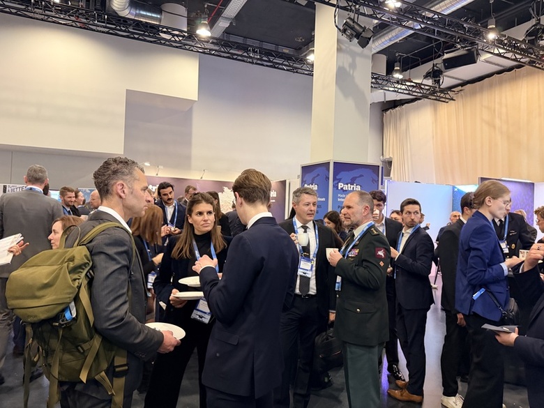 柏林安全會議場邊交流時間,多國軍事與安全政策代表在會場內互動討論,氣氛熱絡。此次會議聚焦俄烏戰爭、混合威脅及印太安全,吸引歐洲及北約多國官員與專家參與。(中央社記者林尚縈柏林攝)