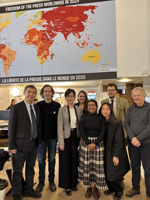 郝培芝在RSF主席韓石(Pierre Haski)、秘書長柏儒廷(Thibaut Bruttin)、亞太辦事處代表艾瑋昂(Cédric Alviani)等人陪同下參訪RSF巴黎總部,RSF榮譽董事吾爾開希也在場。