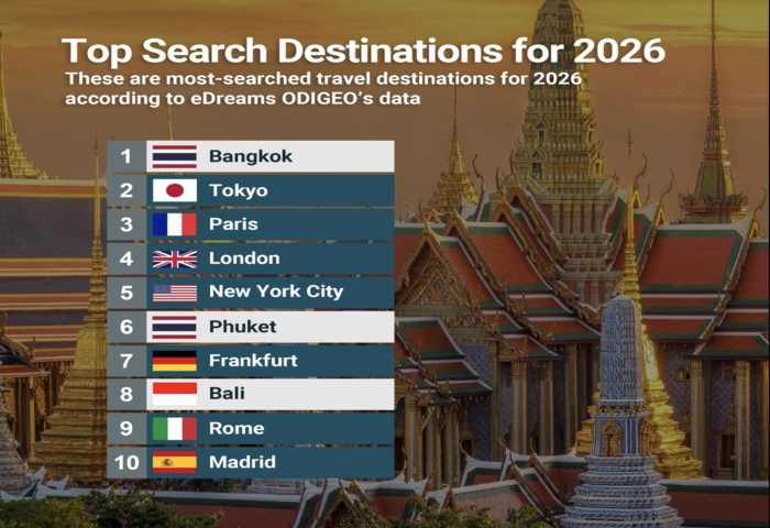 (台泰時報11月21日電)線上旅遊平台 eDreams ODIGEO 公布最新搜尋資料,顯示全球旅客已開始規劃 2026 年旅遊行程,其中曼谷成為搜尋量最高的目的地,反映亞洲主要城市在國際旅遊市場中持續具備吸引力。平台指出,這份排名來自全球旅客於系統中的搜尋行為,呈現旅客初期規劃方向與目的地靈感來源。