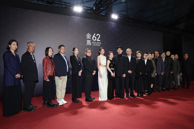 第62屆金馬獎星光大道22日在北流外廣場盛大展開,電影「大濛」入圍最佳男、女主角等多項大獎,劇組團隊開心在紅毯合影留念。(中央社記者吳家昇攝)