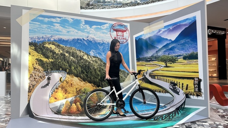 觀光署22日在南灣大型商場舉辦的快閃推廣活動吸引數千人參加,現場以台灣旅遊元素打造台北 101、環島自行車場景3D視覺藝術拍照牆。(中央社記者張欣瑜舊金山攝)