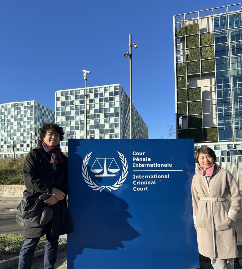 民進黨立委范雲(右)、沈伯洋(左)赴荷蘭出席國際自由聯盟會議,范雲21日晚上發布兩人站在對世界人權有著重要意義的國際刑事法院前的合照。(圖取自facebook.com/daan4fanyun)