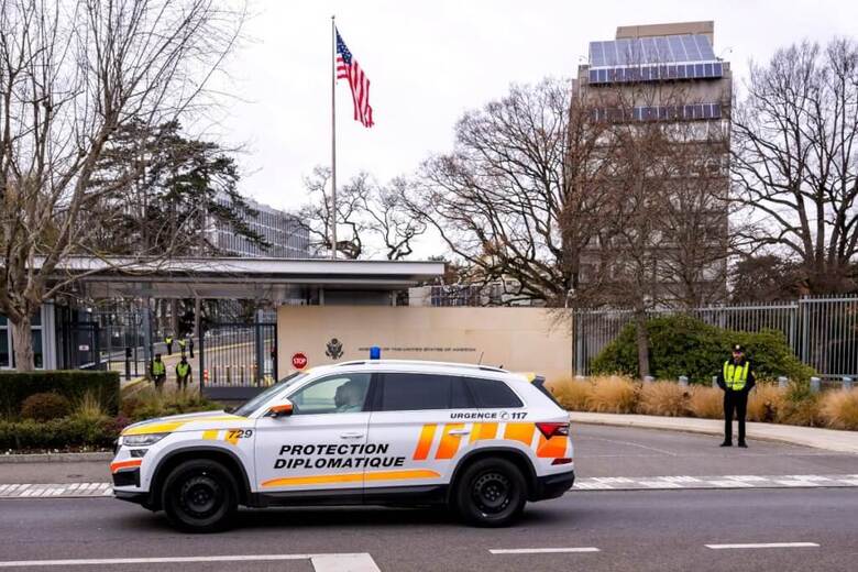 圖為23日一輛外交警衛車開過美國日內瓦代表團門口。 (Martial Trezzini/Keystone via 美聯社)