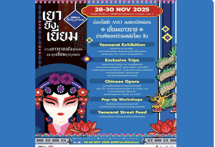(台泰時報11月25日電)曼谷地鐵營運商 BEM 與泰國大眾捷運局合作推動「BEM Happy Journey 2025:耀‧尚‧優」文化行旅活動,將沿線觀光主題延伸至具有深厚中泰文化底蘊的耀華力路,希望透過鐵道串聯城市老街區,讓旅客以更便利的方式認識當地生活與歷史脈絡,並展現老城區「活著的文化」樣貌。