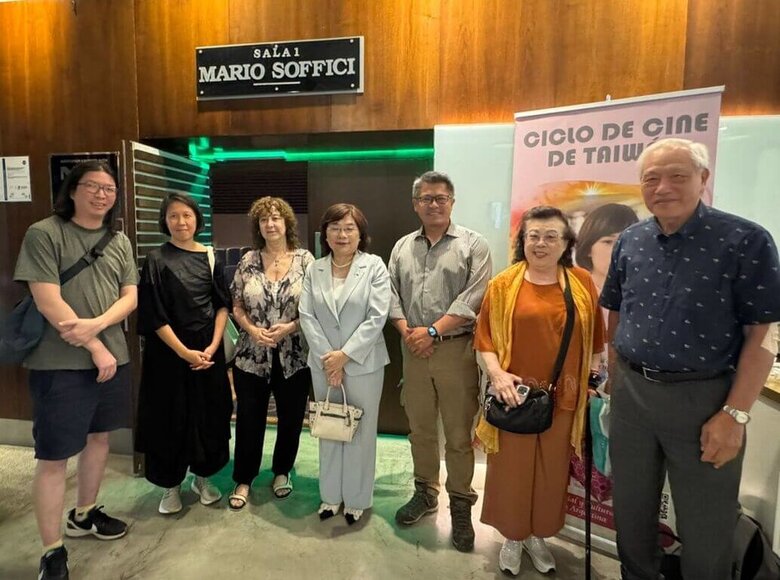 阿根廷電影導演協會與駐阿根廷代表處共同舉辦台灣電影巡迴首場放映「接線員」,阿根廷台裔導演許煌(左1)、旅阿台裔電影美術指導陳孟孜(左2)、阿根廷電影導演協會會長瓜利尼(左3)、駐阿根廷代表處代表謝妙宏(右4)等到場支持。(駐阿根廷代表處提供,中央社記者黃韻如布宜諾斯艾利斯傳真)