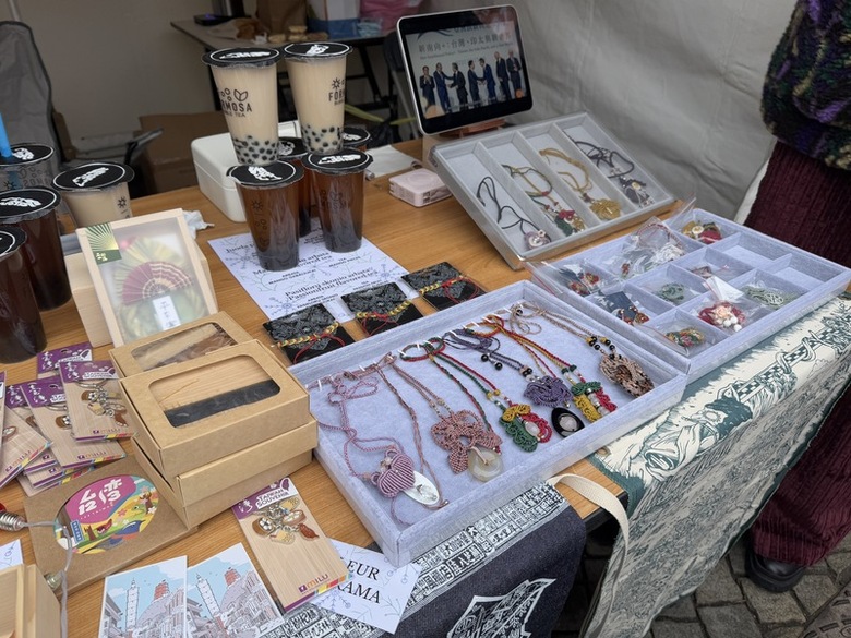 駐立陶宛台灣代表處參與耶誕慈善市集,今年推出台灣茶葉、精油、吊飾、檜木杯墊、珍珠奶茶與手工繩結編織等多樣特色商品,義賣募款做公益。(中央社記者游堯茹維爾紐斯攝)