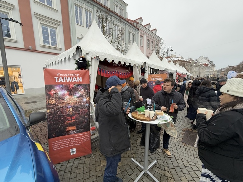 駐立陶宛台灣代表處今年第2度受邀設攤,攤位推出台灣茶葉、精油、吊飾、檜木杯墊、珍珠奶茶與手工繩結編織等多樣特色商品,並帶來具有台灣人情味的「奉茶」文化,提供現泡台灣高山茶,吸引眾多遊客駐足品嘗。