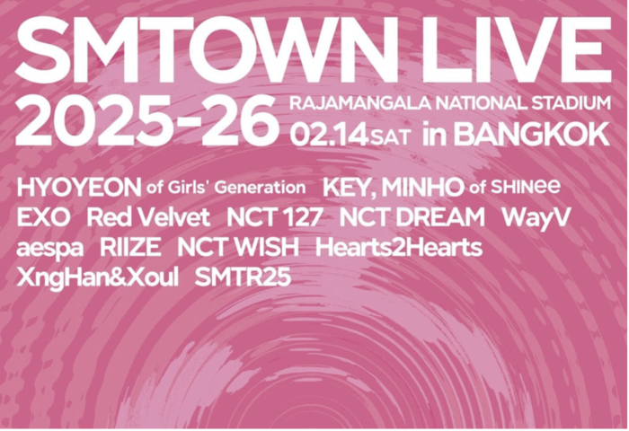 (台泰時報12月3日電)韓國 SM Entertainment 宣布,將於 2025 年 2 月 14 日在曼谷拉瑪甘拉國家體育場舉辦「SMTOWN LIVE 2025–26[THE CULTURE, THE FUTURE]in Bangkok」演唱會,為該系列時隔 13 年後再度回歸泰國。消息公布後,吸引大批粉絲關注。