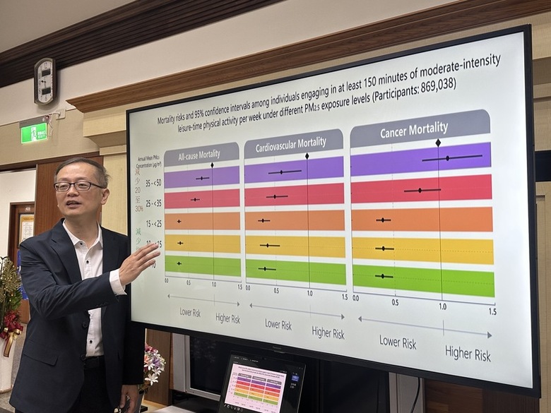 研究發現,每周至少150分鐘中強度運動的活動建議量,在PM2.5年平均濃度低於25μg/m³的環境,可降低全因死亡率約30%。PM2.5年平均濃度達25μg/m³ 以上時,同樣運動量僅能降低12%至15%的風險,效益縮減一半。