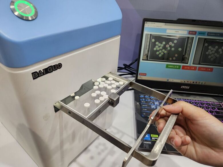 2025台灣醫療科技展4日登場,馬偕醫院導入裸錠藥物AI辨識機,200顆藥錠只需2秒辨識,優化智慧藥事作業流程,大幅減化人工作業壓力。(中央社記者陳婕翎攝)